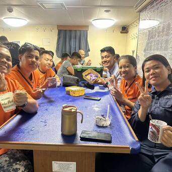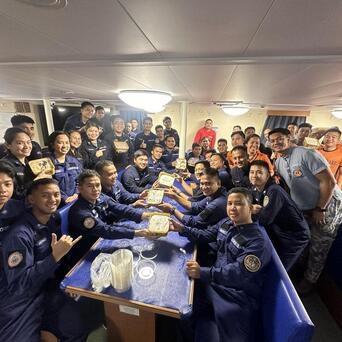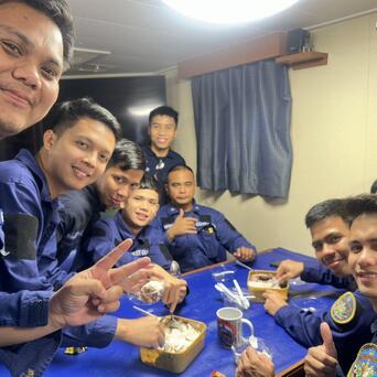 8月9日,在仙宾礁非法滞留的菲海警船上人员,开了一场“甜点派对”,吃上了由菲律宾海警卫司令加万提供的甜点,应该是某种盒子蛋糕。他们还一边吃着蛋糕,一边抬着头,对着镜头比耶比心,看起来挑衅意味十足(图1至图3)。另外,他们还从自己的船上拍摄了中国海警5901舰和中国的渔船(图4),以及抵近菲律宾海警船的中国海警快艇(图5)。